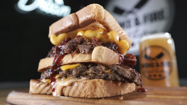 Giant cheesesteaks; a nearly foot-tall burger with twin patties and gyro meat; a meatloaf cupcake topped with mashed potato frosting and veggie sprinkles.