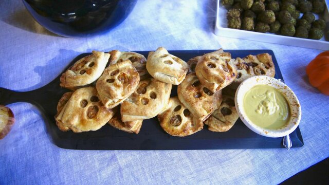 Molly Yeh hosts a Halloween party for all her friends and their little monsters; she makes some spooky treats for her guests, including cheesy Ghost Hand Pies with honey dijon dipping sauce and broccoli FrankenTots with lemon garlic mayo.