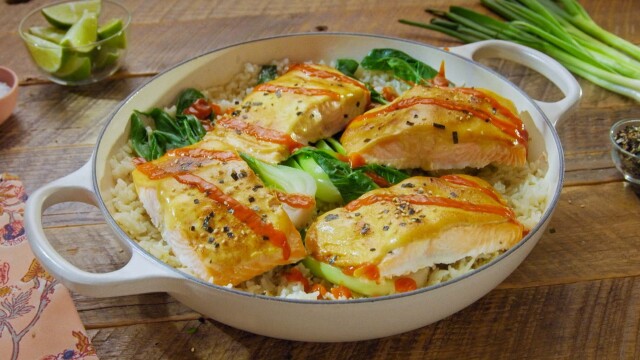Molly Yeh makes a delicious dinner during naptime; she sneaks away to prepare Slow Cooker Asian Wedding Soup, one-Dish Salmon and Veggies, Tamagoyaki and a Red Bean Snacking Cake with Yogurt Glaze.
