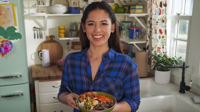 Molly Yeh hosts a sing-along on the farm and serves comforting hamburger mac and cheese, adorable chocolate and strawberry cupcakes for lunch; she prepares crispy rice bibimbap with a side of corn cheese for dinner.
