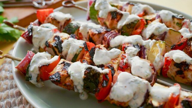 Molly Yeh makes a Greek-inspired meal for her sister, starting with yogurty marinated chicken skewers and perfectly packaged fried feta Greek salad pitas; then, there's skordalia, a creamy potato dip, served with herby grilled pita for dunking.