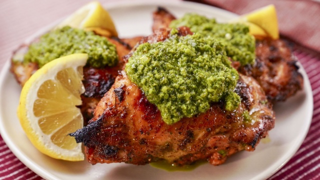 Molly Yeh prepares for Valentine's Day dinner by cooking juicy roasted sumac chicken smothered in zhug sauce, matbucha on a bed of whipped feta, veggie fried rice with middle eastern spices, and chocolate cardamom cake donuts for dessert.