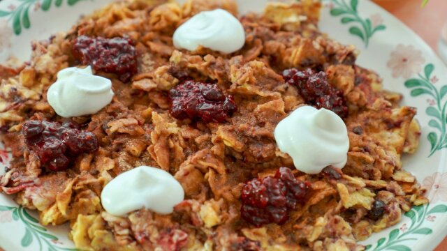Molly Yeh celebrates Passover with heaps of delicious food, including sweet cinnamon sugar mixed berry matzo brei, hearty brisket hotdish and popover salad drizzled with honey poppy seed dressing; gooey matzo magic bars are a dessert treat.