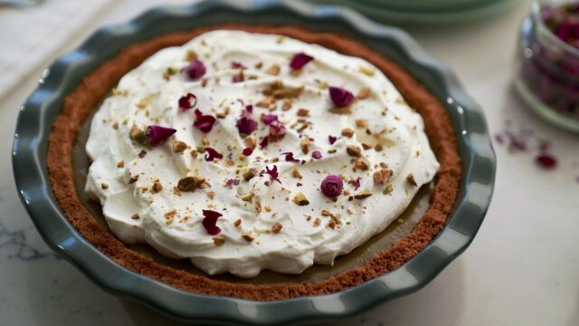 Molly Yeh is celebrating Thanksgiving with tons of food and a tiny parade on the farm; crispy fried turkey breasts with cranberry mayo, everything bagel stuffing, tahini cinnamon sweet potatoes with toasted meringue and pistachio pudding pie.