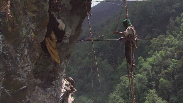 Wabak has to jump from a wooden tower with his ankles bound.