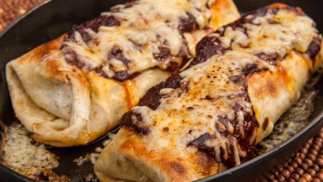 Guy Fieri puts a gourmet spin on burritos; his green chile chicken burrito is packed with chicken, potatoes and peppers, smothered in chile sauce and topped with melted cheese, and it is served up rice with black beans and a cilantro lime cream slaw.