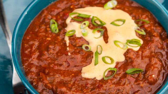 It's almost game day, and Guy Fieri shares his famous Texas-style chili recipe with beer cheddar cheese sauce; on the side, he serves up elevated potato skins with leeks, mushrooms, brie cheese, and prosciutto.