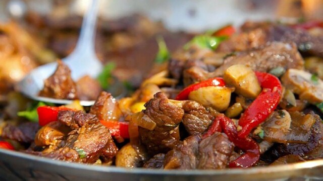 Lamb, with bell peppers, onions, mushrooms, capers and olives; basmati rice pilaf; roasted apricots with mascarpone cheese and pistachios.