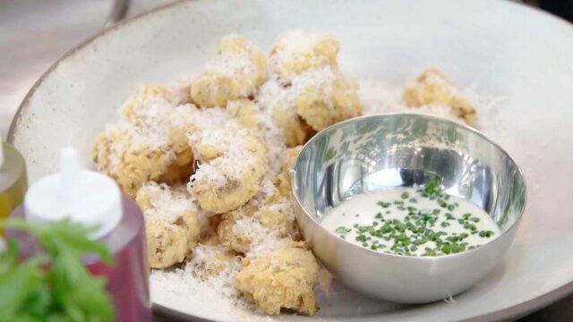 Thanksgiving simplified with some of Guy's favorite chefs; Antonia Lofaso crisps cauliflower with lemony aioli; Marc Murphy makes kabocha ravioli; Michael Voltaggio saves the best leftovers for last with some pumpkin pie egg rolls.