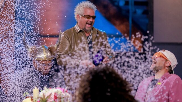 Guy Fieri invites legendary duo Kevin Smith and Jason Mewes, "Entertainment Tonight" co-hosts Kevin Frazier and Nischelle Turner and actor Kym Whitley with her brother Kyle to compete in ridiculous food games in the name of charity.