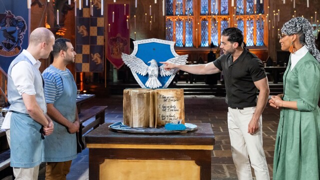 James and Oliver Phelps assign eight pairs of pastry wizards into the four Hogwarts Houses and ask them to create a showpiece with at least one tasting element; Judges Carla Hall and Jozef Youssef decide which bakers move on to the next challenge.