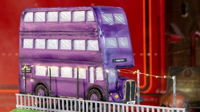 In front of the Knight Bus, James and Oliver Phelps ask the remaining six teams to make transportation-inspired showpieces that incorporate classic English desserts; guest Devon Murray joins Judges Carla Hall and Jozef Youssef.