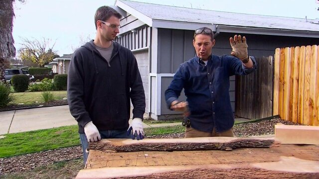 Josh Temple and his crew transform a ho-hum living and dining room into the ultimate modern log cabin space; they create a stacked stone fireplace, a live-edge dining table, a one-of-a-kind walnut reading chair, and a polyhedron coffee table.