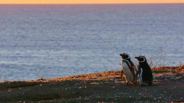 Magellanic penguins greet the sunrise on the Argentine coast of Patagonia.