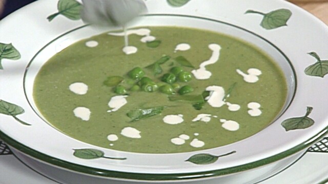 Daniel Boulud prepares chilled green pea soup; Gordon Hamersley tosses a green salad with sherry vinaigrette.