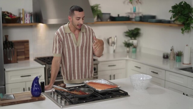 Jake makes two of his favorite super simple crowd-pleasers; first, Iraqi roast salmon slathered in a caramelized onion and tomato sauce that is packed with spice; then, a fudgy date brownie.