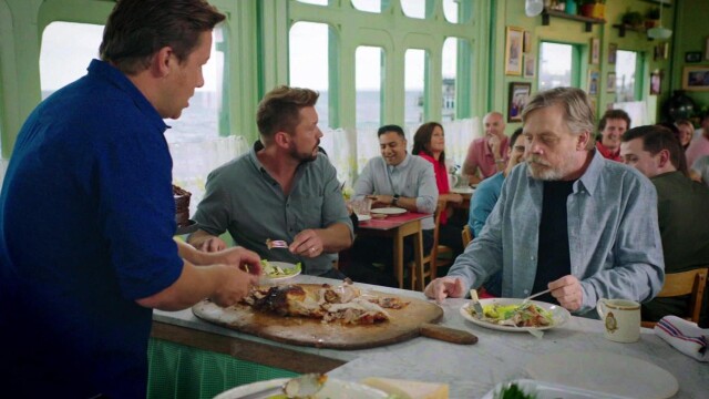 Actor Mark Mark Hamill helps Jamie and Jimmy make roast beef and Yorkshire pudding; a Caesar salad and a seafood feast.
