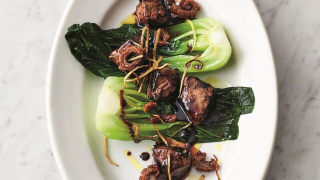 Ginger beef and pak choi; crispy squid and smashed avocado; pork and mash gratin; almond, orange and polenta cake.