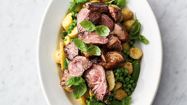 Jamie prepares pan-seared lamb, and a pear and gorgonzola farfalle.