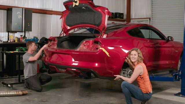 Emily and Aaron Reeves work on another garage project together; their challenge is to fit a 2017 Mustang GT with a quad-tip exhaust kit.