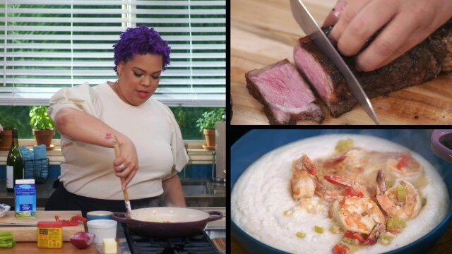 Chef Lovely gathers her girlfriends to catch up with them; she makes bruschetta with goat cheese and glazed figs, shrimp and grits, a New York strip steak with chimichurri, and a cocktail she calls the 1+1 cocktail.