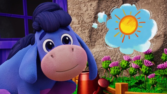 Eeyore is excited to share his happy thoughts; they help him feel happy when he is feeling blue.