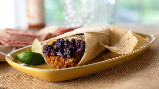 Bean, cauliflower and cheese burrito; chorizo refried beans.