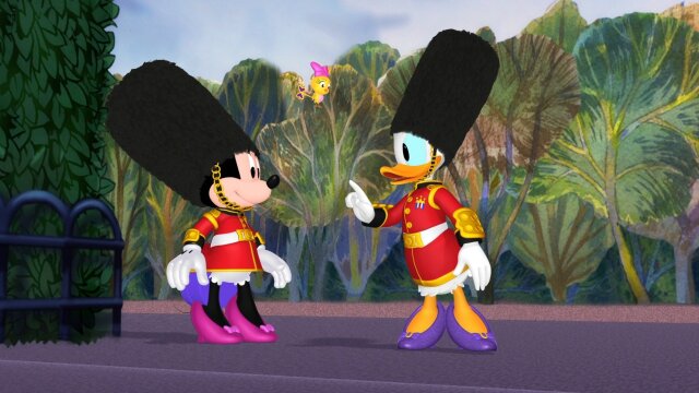 Minnie and Daisy struggle to get past the palace guards in order to deliver a hat to the Queen.
