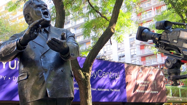 A sacred effigy; the first African-American baseball player; statue of a New York mayor.