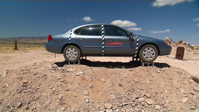 An experiment to see if a blindfolded man can walk a straight line; testing whether binary explosives can be set off by a fender bender.