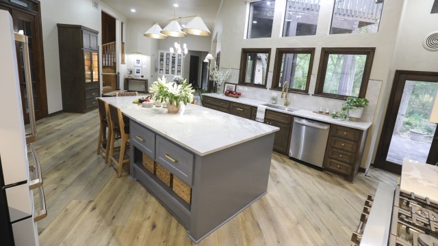 A couple loves the outdoorsy vibe of their lot, but not the house's many quirks; Jenn integrates wood ceilings and a dining room the size of a banquet hall into a traditional organic design to usher their eccentric house into the present.