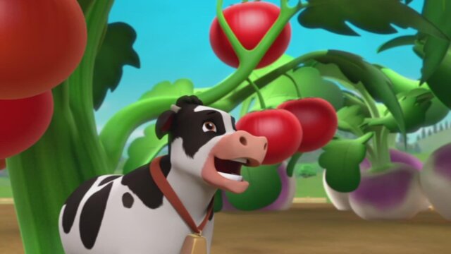 When Yumi's crops begin to sprout huge vegetables, the PAW Patrol must corral the stampeding produce; the pups draw a message for space aliens on Farmer Al's field.