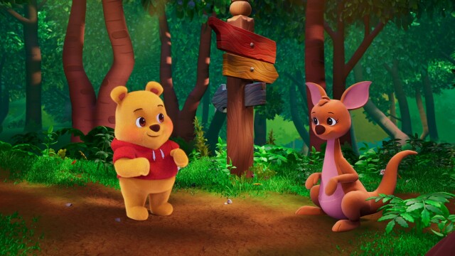 Pooh Bear and Kanga play a game of I Spy in Hunny Hollow. When Pooh Bear struggles to spot the red object, Kanga helps by offering a hint.