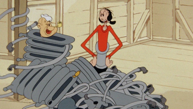 Olive Oyl gives Popeye and Bluto each one half of a house to build for her.
