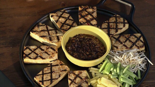 Israeli smoked egg pate; grilled tofu with pineapple, cucumber and a chili-peanut dipping sauce; Thai coconut bananas; Israeli eggplant salad.