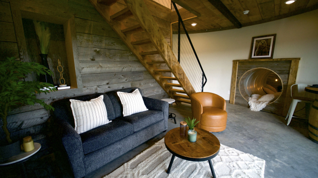 Three abandoned grain silos from the windswept plains of South Dakota are disassembled and rebuilt as rustic and charming guest cottages on a 200-acre ranch in the picturesque landscape of Greycliff, Montana.