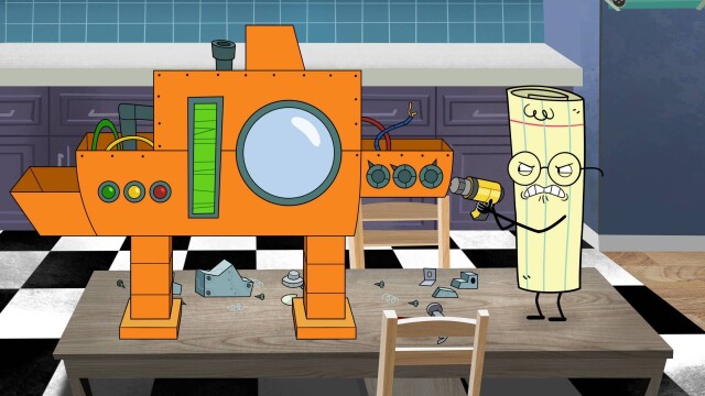 Rock and Scissors learn that Paper invents better when angry; his friends try to enrage him; after Scissors breaks his arm, he tries to hide it from Paper.