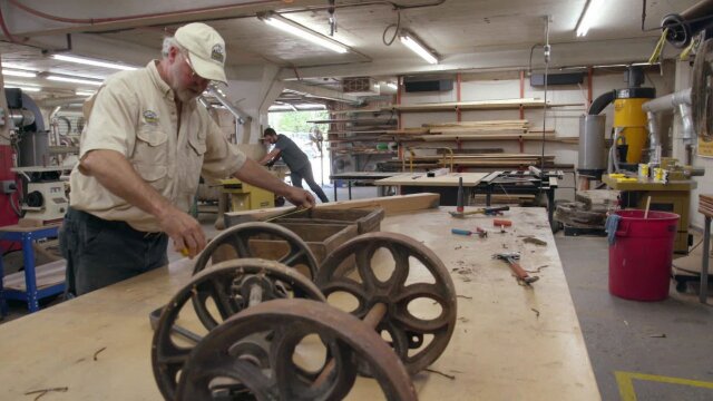 The Dawgs travel to Dublin, Va to help remove a dated water turbine from the historic Belle-Hampton Farm; after a full day of salvage, Mike and Tay return to the shop to build a kitchen island cart.
