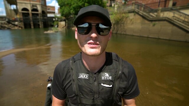 Jake explores a drained river and stumbles into a sunken ship while diving.