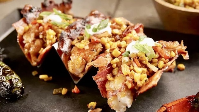 Wood-grilled chorizo with pickled onion, cheese and chimichurri; smoked lobster tacos with bacon tortillas; bacon apple crisp, smoked whipped cream and caramel drizzle.