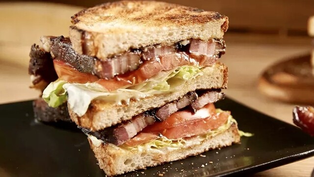 The ultimate BLT with home-cured salt and pepper bacon; the Raichlen pan bagnat; mystery box challenge -- flambeed chocolate banana French toast.
