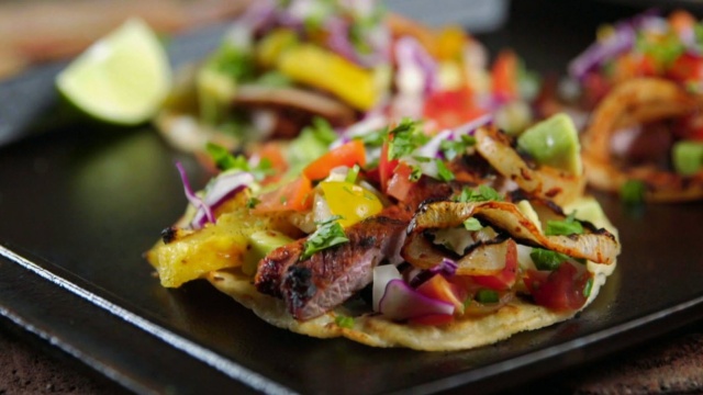 Using a vertical rotisserie to make tacos al pastor; volcano pineapple; mystery box challenge -- sunflower.