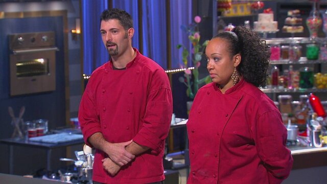 The chefs attempt to make excellent chocolate desserts that include one blue and one yellow mandatory ingredient.