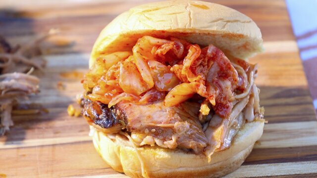 Michael Symon prepares smoked pork butt for pulled pork sandwiches along with crispy fried zucchini chips with Parmesan; for something sweet, Liz combines bananas and hazelnut spread to make campfire toasties.