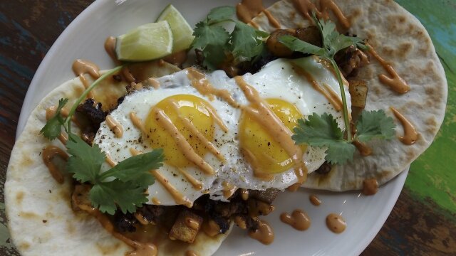 Spicy salad with a burrito containing fried plantains; spicy Cubano tacos; breakfast tacos; tequila scallop tacos.