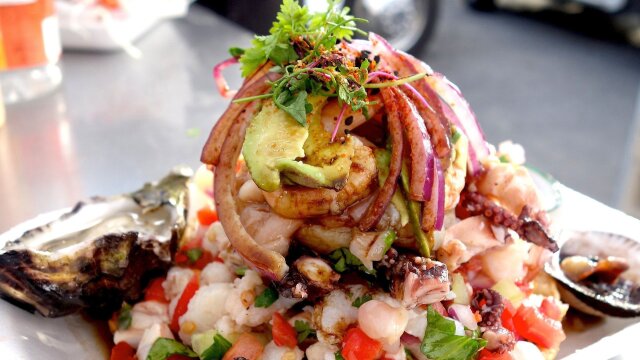 Layers of fish and shrimp ceviche on the tostada loca at Mariscos German Beyer; traditional lamb head barbecue at Aqui Es Texcoco; pork carnitas tacos at Carnitas Snack Shack; smoked fish tacos at Oscar's Mexican Seafood.