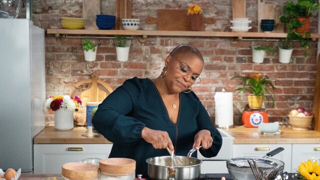 Catching up with Tanya and her staff at her restaurant, Brown Sugar Kitchen; she serves up garlic mustard roasted pork, savory bread pudding with corn, cheddar and thyme and lemon bars.