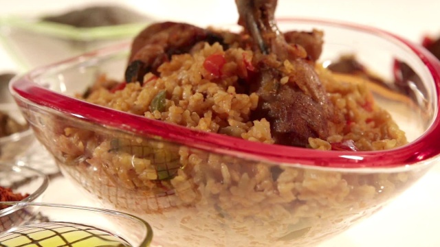 Arroz con pollo; applesauce empanadas; garden iced green tea.