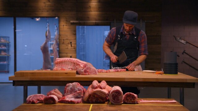 Four butchers must break down a pig using an old-school hog splitter; the remaining three are tasked with cutting steaks and eyeballing to weight without a scale; the final two advance to the final round where a mystery beast is revealed.