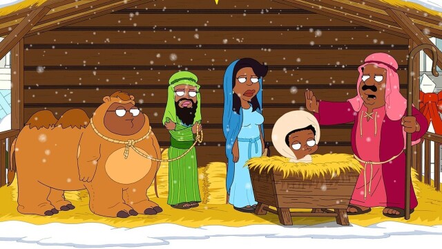 While posing in a Nativity scene, Cleveland tells the family his version of "Die Hard," one of his favorite holiday tales.